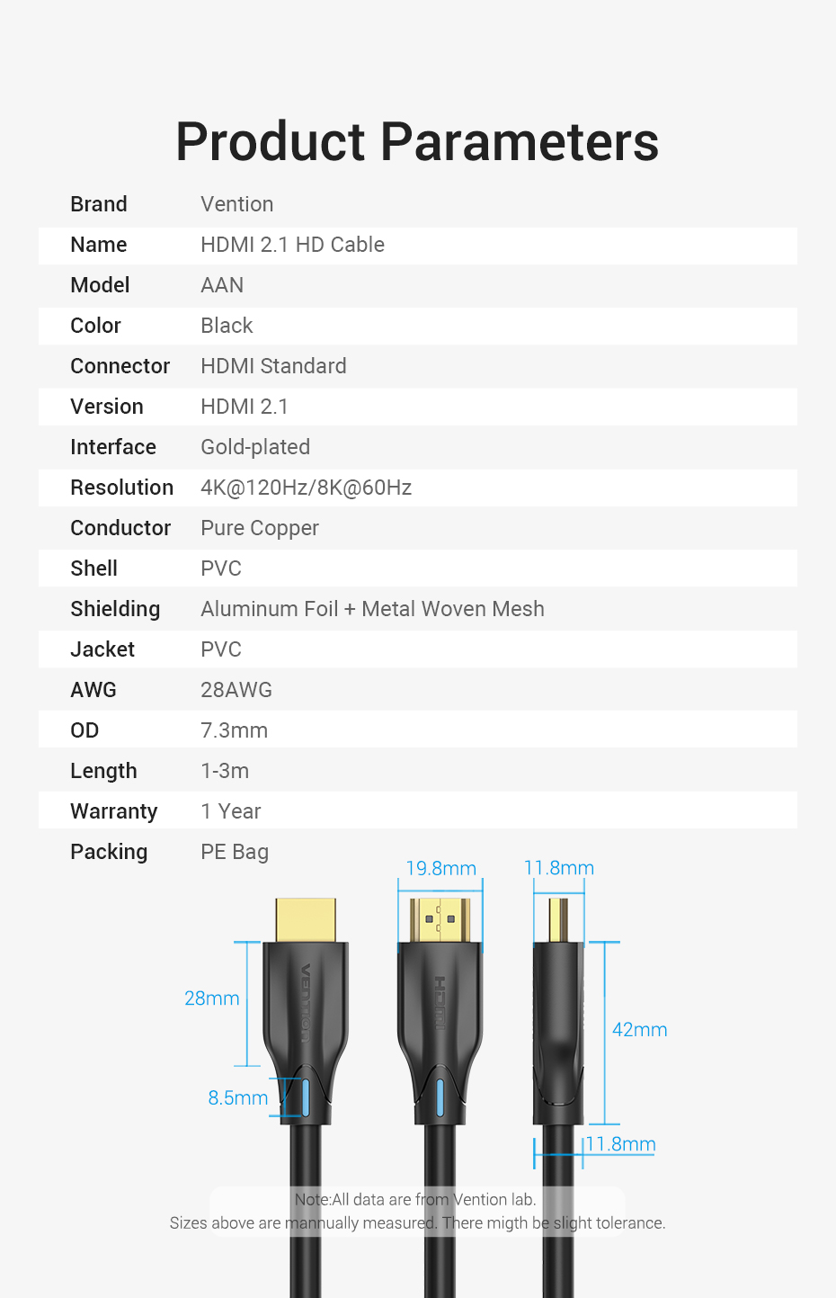 Цифровой кабель новейшего поколения для подключения источника видеосигнала и устройства отображения. Канал Ethernet позволяет нескольким устройствам работать в сети Ethernet без необходимости подключения дополнительных проводов, а также напрямую обмениваться контентом, на скорости до 100 Мбит/сек.. Кабель имеет пропускную способность до 48 Гб/сек, поддерживает разрешение 8K (4320p) Ultra HD, 3D-возможности, Blu-ray, а также поддержку более чем 8 каналов аудио. Наличие обратного канала аудио устраняет необходимость в отдельном проводе для передачи звука в ресивер с телевизора или другого устройства, которое является одновременно источником аудио и видео.