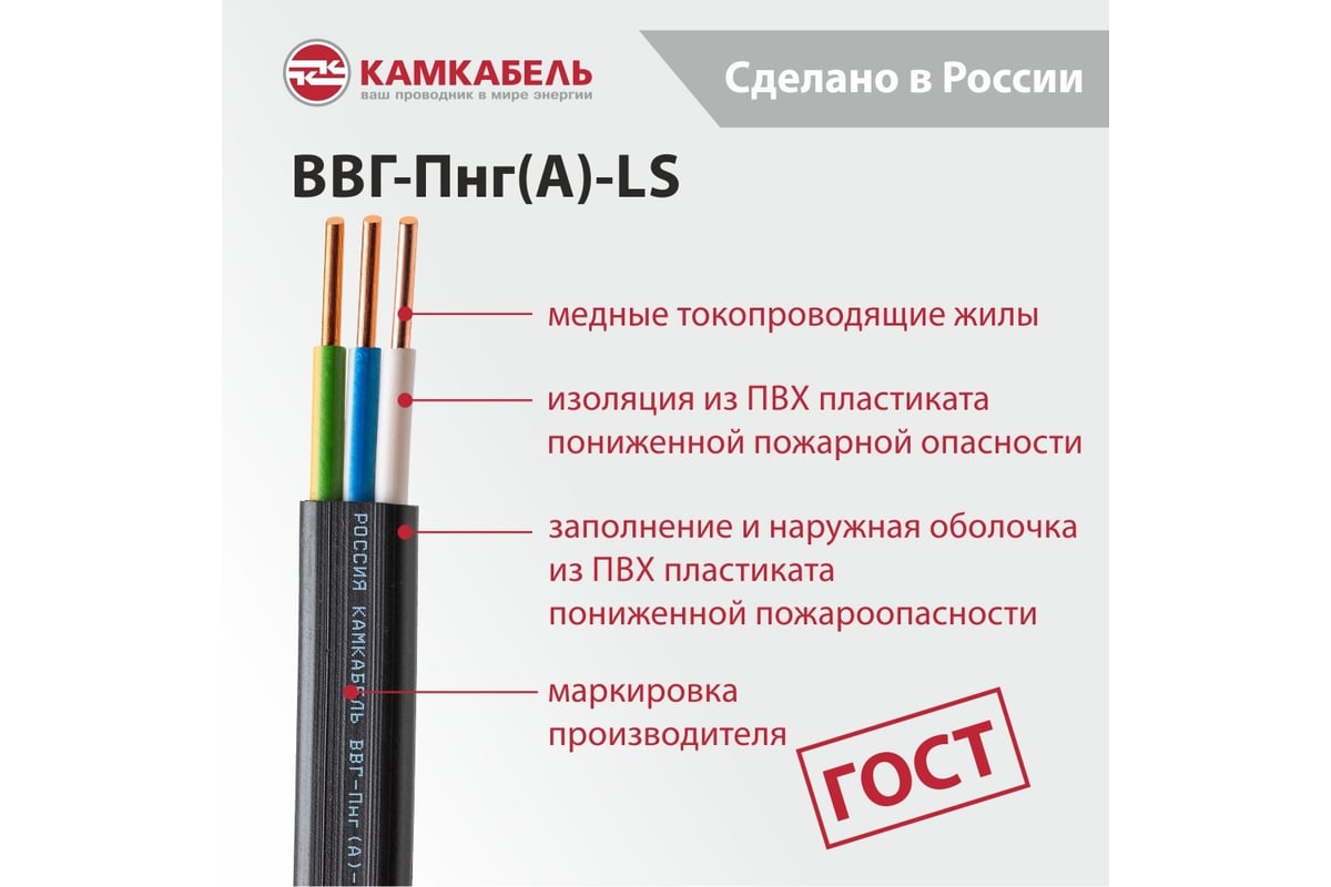 - Кабель ВВГ-ПНГ А - LS Камкабель 3x2.5 мм 100 м ГОСТ 1157К30HG00070А0100М не распространяет горение при прокладке в пучках (нормы МЭК 60332-2 категории А и В).
