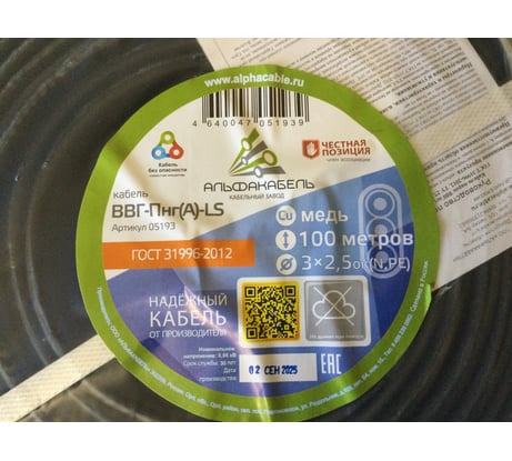 Вопросы и ответы о кабеле АЛЬФАКАБЕЛЬ ВВГп-НГ LS 3х2,5 мм ГОСТ 100 м 05193
