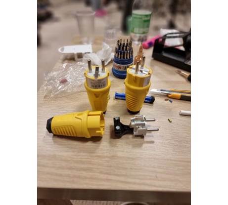 Резино-подобный корпус без запаха. Влаго и пылезашита IP54. Штыри вилки абсолютно не люфтят (не качаются и не вращаются -проверено на 4 экз разных цветов корпуса). Каждая отдельная деталь легко и без зазоров входит в другую. Крупные головки винтов позволяют легко и сильно затягивать провод. Большие отверстия под провода в штырях, позволяют легко вводить в них провод до 2,5 мм2