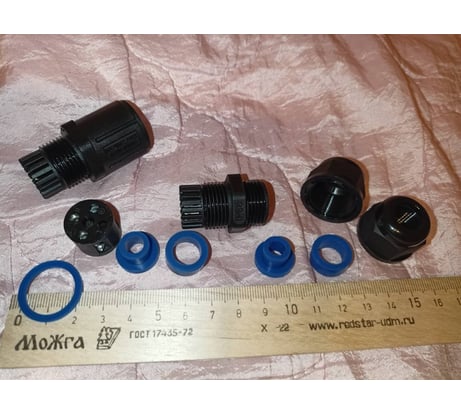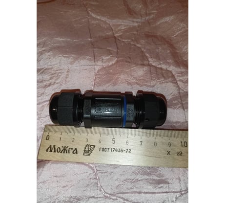Быстроразъемная кабельная муфта IP68 для улицы. Подходит для уличного освещения, подходит для питания во влажных помещениях. Сальники с гайками M20x1.5, можно пропустить кабели диаметром от 5 до 11мм. Уплотнители сальников и прокладка корпуса из синего силикона. Клемма внутри разборная, в каждую винтовую колодку входят 2 жилы по 1.5мм2. Пластик нормального качества, не хрупкий. Колодки клеммы слабо магнитятся. Винты шлицевые, магнитятся хорошо. Длина муфты около 85мм, диаметр 27мм.