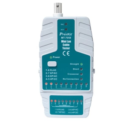 Кабельный тестер ProsKit MT-7058 00284942 отличается компактными размерами. Предназначен для проверки и выявления неисправностей, как обрывы, скрещивание, расщепление пар и т.д. Подходит для LAN-кабелей, RJ45 TIA568A / B (AT & T) 258A), 10 Base-T, Token Ring, RJ-11/RJ-12 USOC и коаксиальный кабель BNC.