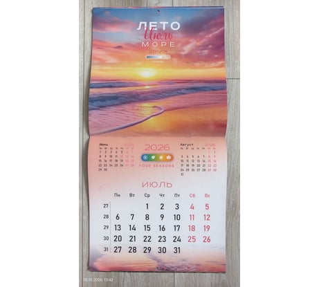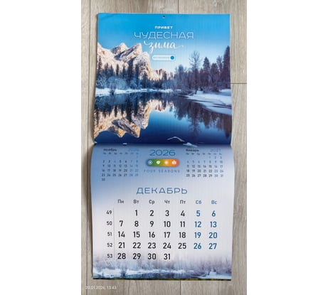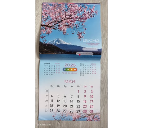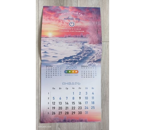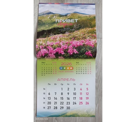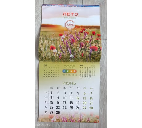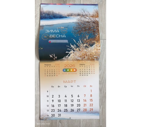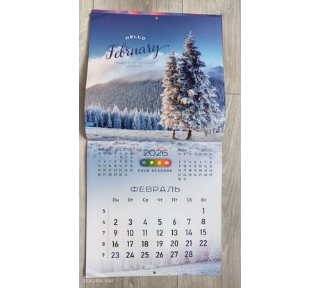 Отличный календарь. Мелованная бумага, плотная. Со вкусом (на мой взгляд) подобраны отличные картинки (фото прилагаю). Календари с природой мои самые любимые. Статический курсор для дат (фото прилагаю). Не пойму почему здесь не представлено магазином ни одной картинки с ним? Это упущение со стороны магазина, т.к.значимые элементы надо показывать. Чтобы курсор держался надо его потереть немного об листы календаря и тогда он отлично держится. Удобная штука. В раскрытом виде размеры календаря как и заявлено 570х285. Покупался календарь за 156 руб. Минус магазину за качество доставки. Пришел календарь с мятыми углами (фото прикладываю ). Ну что это такое? Товарный вид подпорчен. Почему я должна любоваться каждый день на зажеванные углы? Менять уже не было времени. Положила под пресс для выравнивания. В середине календаря проложена транспортировочная картонка для плотности.