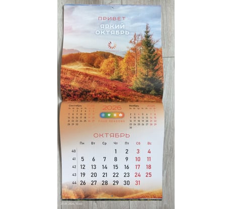 Блок календаря напечатан на мелованной бумаге плотностью 130 г/м2. Оригинальная обложка изготовлена из мелованной бумаги плотностью 230 г/м2. Размер – 28,5х28,5 см, в развороте – 28,5х57 см.