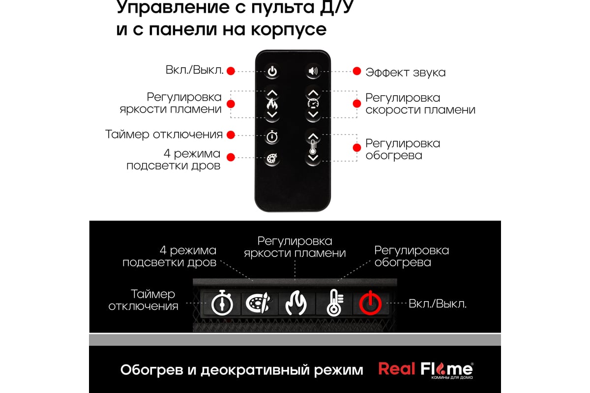5 вариантов цвета пламени, 2 уровня регулировки обогрева