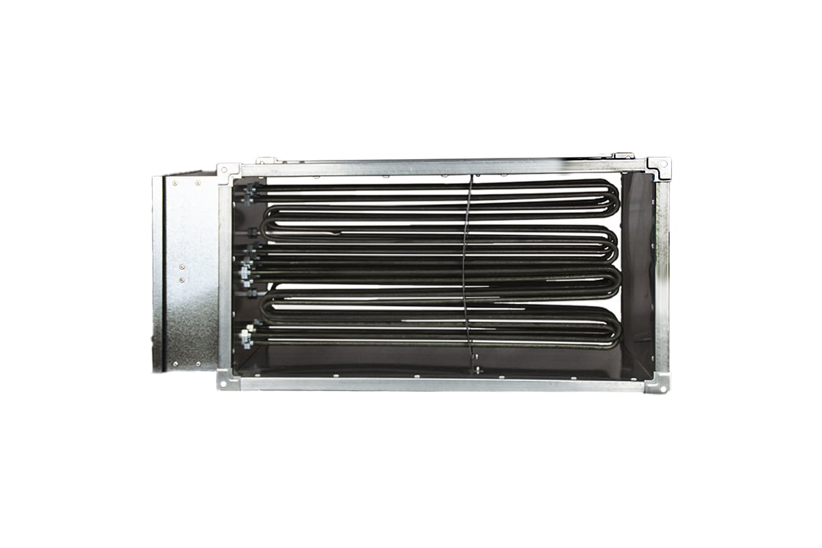 Электрический канальный нагреватель для прямоугольных каналов, корпус и коммутационная коробка изготовлены из оцинкованного стального листа, нагревательные элементы из нержавеющей стали.