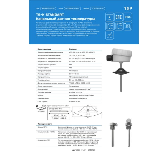 Канальные датчики температуры серии TS-K: это термопреобразователи с длиной зонда от 100 до 300 мм и корпусом из ABS-пластика с клеммной колодкой, которые используются для измерения температуры подаваемого воздуха в каналах вентиляционных установок, центральных кондиционерах и системах общеобменной вентиляции. Канальные преобразователи могут быть использованы как погружные датчики температуры в комплекте с гильзами серии D (см. раздел аксессуары). В комплект поставки входит монтажный фланец для крепления к воздуховоду.