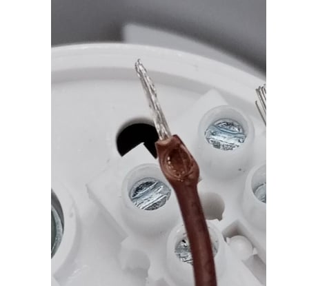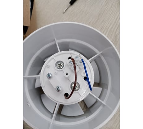 Сегодня забрал из пункта выдачи заказов, и сразу "косяки" обнаружил! Синий провод вообще в клеммную колодку зажат не был, просто был вставлен в просвет между винтом и латунной втулкой, и выскочил оттуда, стоило мне к нему пальцем прикоснуться! Коричневый провод был зажат через изоляцию - на фотографии видна вмятина на изоляции от винта. То есть сборщик на заводе постарался сделать так, чтобы этот вентилятор не заработал при включении или проработал недолго - до тех пор, пока контакт не пропадёт. Но я тоже не лыком шит - вовремя обнаружил его закладку!