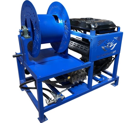 Комплектация включает аппарат высокого давления с регулятором, барабан со 100-метровым рукавом, промывочные форсунки (включая турбофрезу) для труб диаметром 350-500 мм, аккумулятор и стационарную раму.