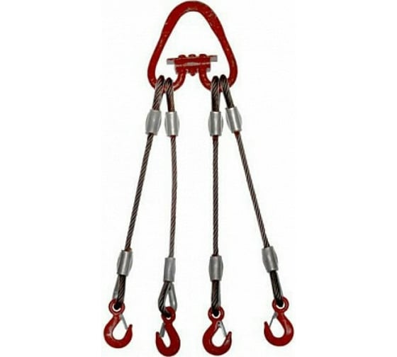 Канатный четырехветвевой стальной строп КанТраст 4СК 6,3/6000 (опрессовка) 4SKO636000 представляет собой надежное грузозахватное приспособление, состоящее из четырех стальных тросов, звена соответствующей грузоподъемности, чалочных крюков на концах для надежного удержания груза.
