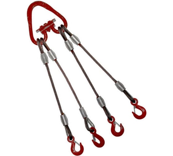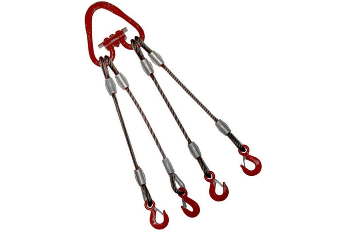 Канатный четырехветвевой стальной строп представляет собой надежное грузозахватное приспособление, состоящее из четырех стальных тросов, звена соответствующей грузоподъемности, чалочных крюков на концах для надежного удержания груза.