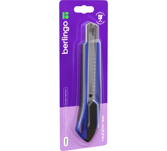 Канцелярский нож Berlingo серии Razzor 300 синего цвета выполнен из высококачественного ABS пластика с применением технологии двойного литья (прорезиненные вставки). Имеет металлические направляющие. Ширина лезвия: 18 мм. Модель имеет автоматическую фиксацию лезвия AUTO-LOCK и дополнительно оснащена замком блокировки. Комплектуется износостойким лезвием из стали SK5. Индивидуальная упаковка – блистер с европодвесом. На оборотной стороне блистера есть перфорация для более удобного извлечения инструмента из упаковки.