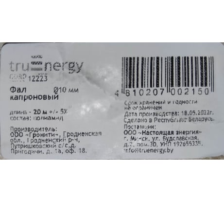 Фал капроновый от бренда truEnergy (артикул: 12223). Вес изделия составляет 1,3 кг, а длина — 20 м при диаметре 10 мм. Фал обладает разрывной нагрузкой 1850 кгс.