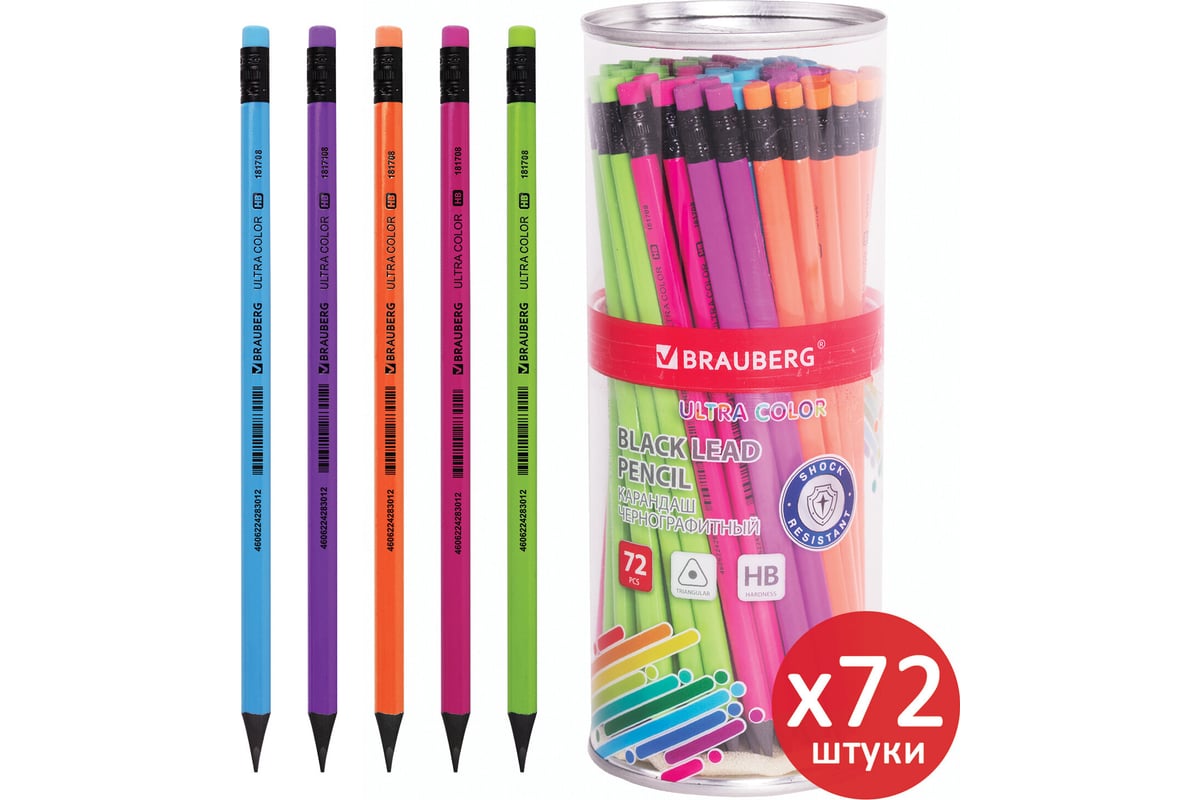 Чернографитный карандаш BRAUBERG hb с ластиком, ultra color, выгодный комплект 72 штуки 880762