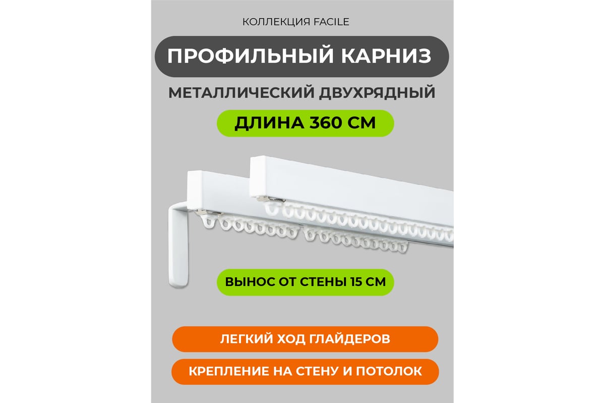 Карниз Facile standard стеновой двухрядный белый 360 см. Универсальный карниз FACILE — это современный, стильный карниз для штор из алюминиевого профиля, позволяющий создавать любое количество рядов и длину. Он комплектуется стеновыми кронштейнами и потолочными держателями. Вы сможете использовать его как карниз потолочный, так и настенный, учитывая особенности вашей комнаты. Он идеально впишется в любой интерьер и подойдет как карниз на кухню, в гостиную, детскую. Карниз для штор двухрядный со стеновым креплением позволяет установить его на минимальном расстоянии от потолка и визуально увеличить высоту комнаты. Он идеален для натяжного потолка без ниши. Карниз настенный двухрядный FACILE с потолочными держателями содержит 2 ряда профиля с возможностью декорировать окно и портьерами, и тюлем. Допустимая нагрузка на карниз составляет 3 кг, что является достаточным даже для навески тяжелых штор – бархат, велюр, шторы блэкаут. Высота профиля небольшая, всего 2,3 см и легко закрывается шторой с широкой шторной лентой, создавая эффект ниши. Вынос кронштейна составляет 15 см от стены, что помогает скрыть шторами выступающие трубы отопления. Помимо стеновых кронштейнов в комплектацию входят и потолочные держатели – они с лёгкостью помогут прикрепить карниз к потолку и использовать его как потолочный карниз.
