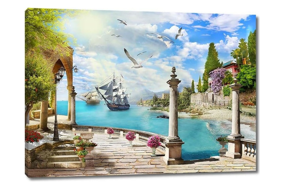 Картина ООО Первое ателье Парусники в бухте и набережная 60x44 см ps78684-3 изготавливается путем высококачественной фотопечати на холсте, который натягивается на деревянный профессиональный подрамник. Напечатана непахнущими интерьерными латексными красками, имеющими европейские сертификаты, которые позволяют использование в дошкольных и медицинских учреждениях. Холст тонкого плетения. Аккуратный задник картины.