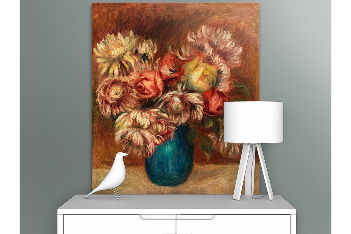 Картина Первое ателье репродукция "Цветы в зеленой вазе" 60x71 ШxВ ps111111-3 изготавливается путем высококачественной фотопечати на холсте, который натягивается на деревянный профессиональный подрамник. Напечатаны непахнущими интерьерными латексными красками, имеющими европейские сертификаты, которые позволяют их использование в дошкольных и медицинских учреждениях. Холст тонкого плетения. Аккуратный задник картины.