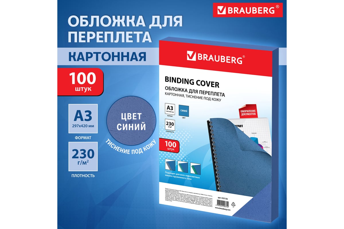 Картонные обложки для переплета BRAUBERG А3, комплект 100 шт, тиснение под кожу, 230г/м2, синие 532156