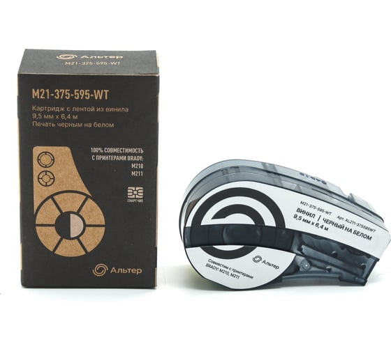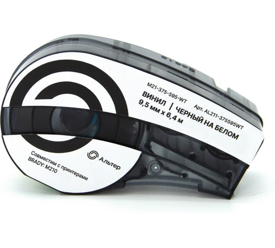Картридж Альтер M21-375-595-WT с лентой из винила, 9,5 мм х 6,4 м, черный на белом, для BRADY M210 AL211-375595WT