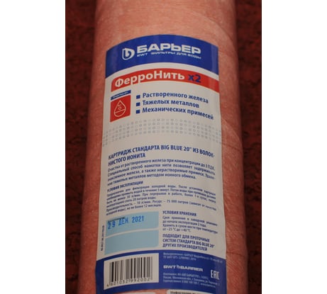 Фильтроэлемент ФерроНить х2 BB 20 Барьер Р542Р03 предназначен для очистки холодной воды от растворенного железа, тяжелых металлов и нерастворимых механических загрязнений. Изготовлен из волокнистого материала. Используется в магистральных фильтрах Барьер стандарта Big Blue 20".