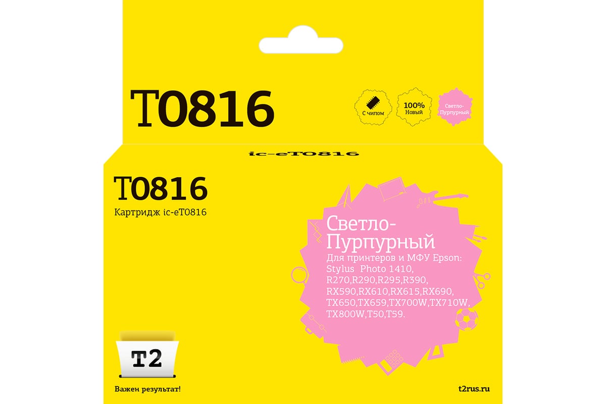 IC-ET0816 Картридж T2 для Epson Stylus Photo R270R/290/R390/RX690/TX700, светло-пурпурный, с чипом. Подходит для Epson Stylus Photo 1410;R270, R290, R295, R390, RX590, RX610, RX615, RX690;Epson Stylus Photo T50, T59;TX650, TX659, TX700W, TX710W, TX800W. Аналог картриджа C13T0816/T1116/T0816/Epson Stylus Photo R270/R290/R390. Все картриджи и чернила для принтера T2 протестированы по стандартам STMC и ISO.В повседневной работе проявляют себя не хуже оригинальных расходников.Фирменный тонер (краска) позволяют получить детализованные отпечатки на бумаге - краска не растекается и не допускает смазывания изображения. Всегда яркие краски и никаких пачкающих пятен на бумаге.