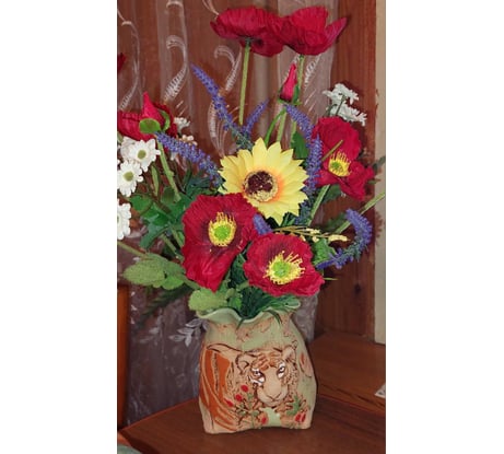 Кашпо просто прелесть. Керамика. Живые цветы не стала ставить, побоялась испортить кашпо. поставила искусственные цветы. Смотрится очень мило на мой взгляд