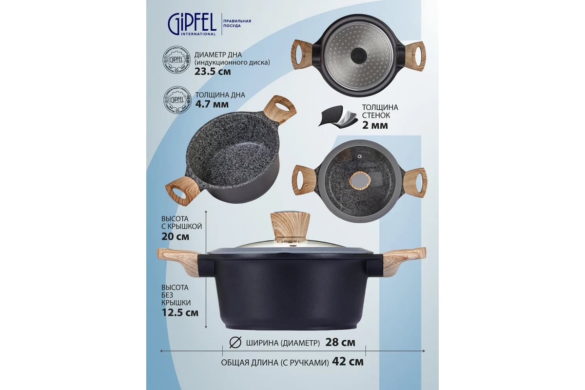 Кастрюля Gipfel OLIVER 0573 28х12,5 см из литого алюминия с индукционным дном. Толщина стенок 2мм, толщина дна 4,7мм. Кастрюля с гранитным антипригарным покрытием Pfluon Granite и бакелитовыми ручками с покрытием Soft-touch. Диаметр составляет 28 см, а высота стенок – 12,5 см.