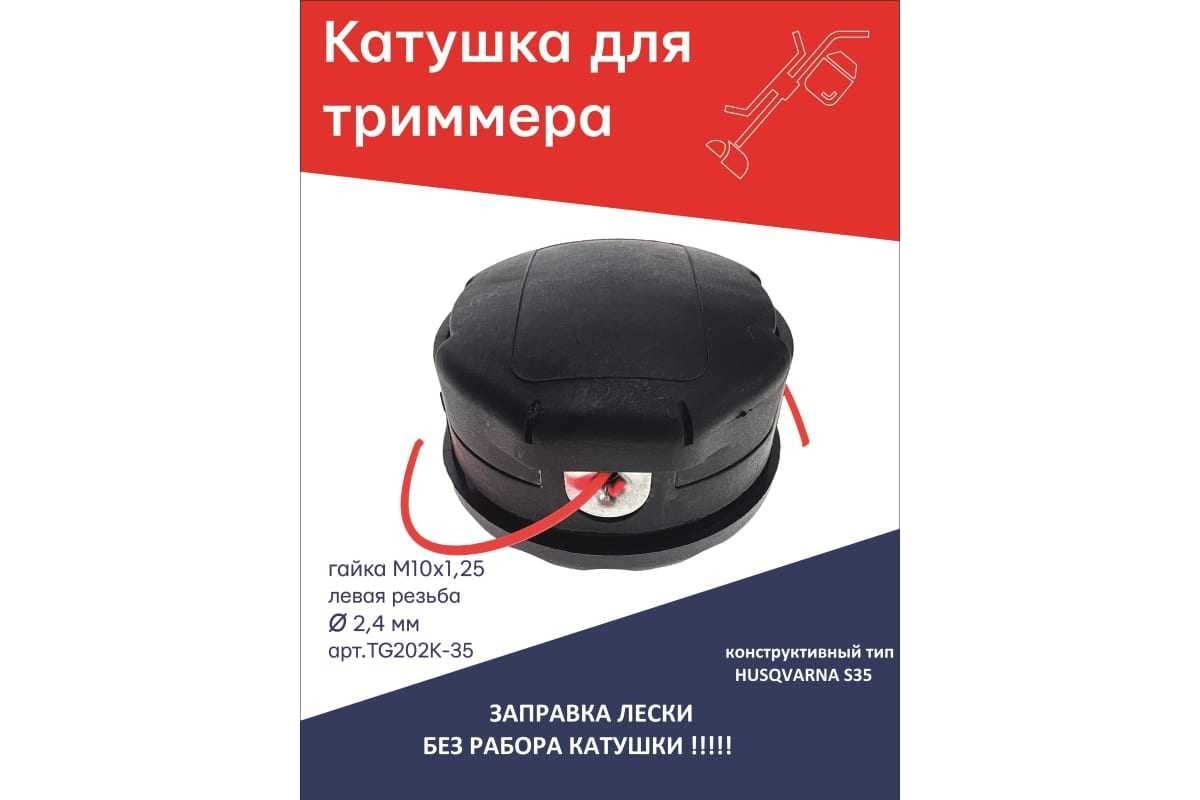 Головка триммерная полуавтоматическая (конструктивно схожая с катушкой типа Husqvarna T35; CHAMPION HT42, C5142) - с посадкой гайка М10x1.25 LH левая резьба - подойдет для бензотриммеров с прямой штангой Husqvarna, а так же для Patriot, Champion, Denzel, Huter, и любым другим электро- и бензотриммерам с соответствующей посадкой и мощностью.