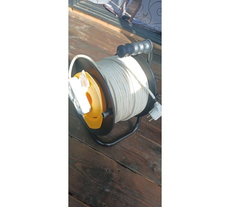 Намоталось 60 метров кабеля КГтп-ХЛ 2х0,75; по описанию производителя кабеля (сам не проверял) его наружный диаметр 7,1 мм. Может, еще метров 5 влезет, максимум 10, больше не получится. Для моих задач (организация удлинителя для триммера, и не только для него) подошло. Вращение катушки на оси не идеальное, но мне норм. Есть маленькая ручка для вращения катушки, удобно. Встроенная в конструкцию розетка мне не нужна, просто выведу кабель с вилкой наружу через это место.