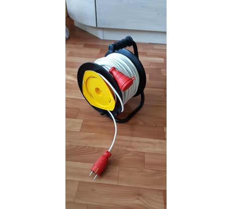 В описание есть неточности, вводящие в заблуждение. Ничего электрического в катушке нет, потому строки описания про силу тока, мощность и число гнезд нужно вычеркнуть и забыть. В реальности есть просто катушка для намотки удлинителя, сбоку в которой есть углубление и две дырки (они не совсем круглые, поэтому именно дырки, а не отверстия), куда можно вставить вилку, просто что-бы не болталась. Кончик провода с вилкой можно выпустить из катушки и намотать в зазор между катушкой и желтой боковиной (там есть зазор примерно 2x2.5 см). Диаметр цилиндра катушки - 136мм, диаметр боковин - 250 мм, что дает зазор примерно в 57мм. Наматывать заметно больше не получится - зазор до ручки всего 70мм. Ширина внутри около 135 мм, снаружи -170мм. Таким образом - площадь сечения примерно 90см^2, а средняя длина витка - чуть более 60 см.