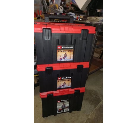 Отличный прочный и вместительный инструментальный ящик из системы хранения Einhell E-Case M. Долго его ждал и как только увидел в продаже сразу купил. Может быть в будущем возьму ещё один. Порадовало, что он может быть не только нижним с пристыкованными к нему сверху меньшими ящиками Einhell E-Case System Box foam 4540011, но и сам может на их становиться и закрепляться. Это может быть нужно например когда в большом ящике что-то тяжелое, а в маленьком легкое. Такая конфигурация не будет перегружать пластиковые защелки. Товар считаю нужным и полезным тем, кто сам в состоянии что-то крутить, резать, клеить, чинить и т.д. и не боится брать в руки инструмент. У таких людей немало инструмента и рано или поздно встает задача это всё хранить. И лучше, если хранение будет организованным, а не одно в шкафу, другое на балконе, третье в гараже, четвертое не помню где. Да и при необходимости транспортировки инструмента очень сильно помогает. Этот кейс очень вместительный. Вместительнее чем два меньших вместе взятые. У меня в него уместились одновременно дрель, многофукциональный инструмент (реноватор), шуруповерт с аккумулятором, лобзик, три айнхелевских кейса расходки с набором бит, сверел по дереву и металлу, вся расходка для реноватора и набор пилок для лобзика, набор коронок по дереву и зарядное устройство (см. фото). И это не предел. Можно положить ещё что-то.