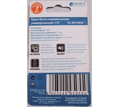 Керамическая кран-букса OLIVE'S OL MC24R20 выполнена из высококачественной латуни. Механизм кран-буксы изготовлен из керамики. Гарантированная работа кран-буксы в течение 500 000 циклов открытия-закрытия.