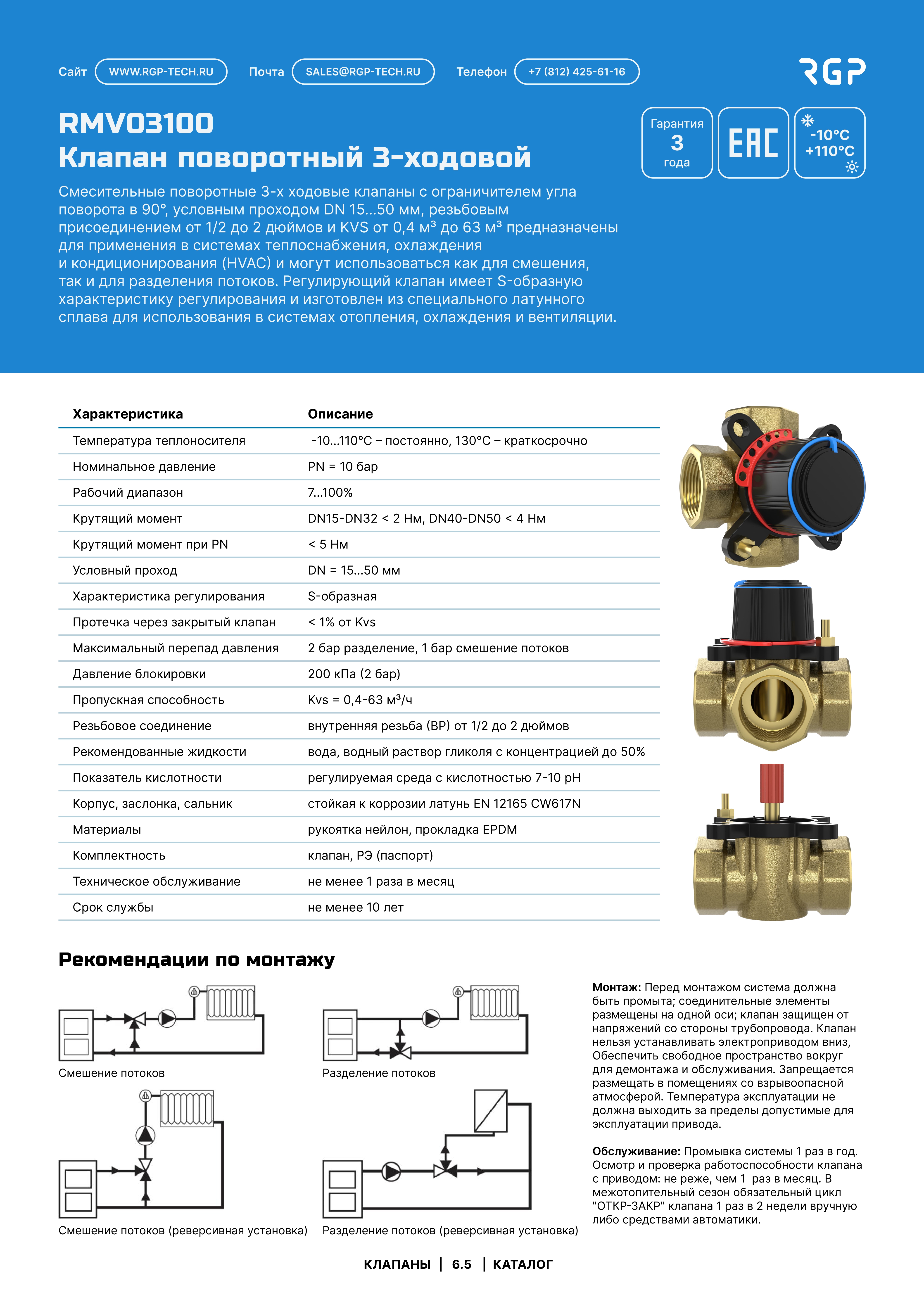 Клапан поворотный 3-ходовой Завод RGP (DN50,Kvs40,PN10,ВР2) RMV03100-200-40