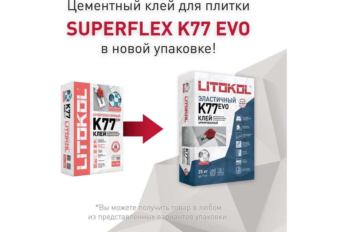 LITOKOL SuperFlex K77 класс C2TES1, 25 кг 75160002 - клей фиброармированный эластичный тиксотропный для укладки натурального камня, керамической плитки и керамогранита в том числе крупного формата размером до 240х240 см.