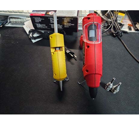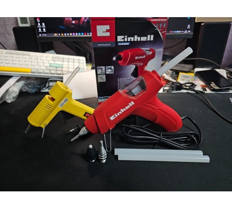 Приобрела мужу на замену дешевому клеевому пистолету на 7мм от одной известной и многими любимой фирмы на 4 буквы (начинается на D...). Данный же пистолет под стандартные 11 миллиметровые стержни. Хорошо лежит в руке по сравнению с той крохой на 60 Ватт и имеет достаточную мощность, чтобы быстро прогреться и приступить к работе. Что можно выделить первым, так это узнаваемый проверенный немецкий бренд, который ценится в любых кругах, сделан качественно и на совесть, есть хорошая гарантия сроком на 2 года, яркий окрас выделяющий его на фоне другого инструмента в квартире, конечно же цена по сравнению с другими производителями, и напоследок комплектация с дополнительными сменными соплами для удобства в работе под любые задачи. Фото со сравнением будут ниже представлены.