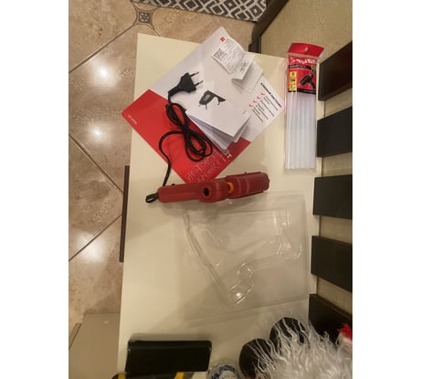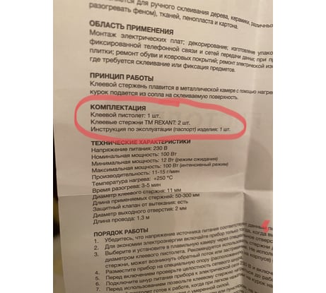 В комплектации по паспорту должны быть клеевые стержни TM REXANT-2 шт. В реальности их нет.