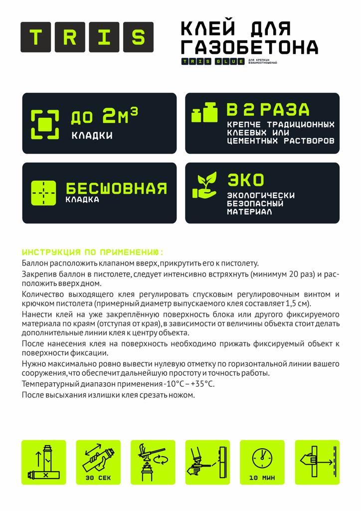 Однокомпонентный полиуретановый вспенивающийся клей Termolit (11 баллонов клея+пистолет+очиститель) - специальный строительный клей высокой механической прочности для надёжной фиксации строительной кладки, газобетонных, кирпичных, пазогребневых, газосиликатных, силикатных блоков, пенополистирольных плит, гипсовых, керамзитобетонных и железобетонных изделий, в том числе ФБС (фундаментный блок стеновой) и полистиролбетонных блоков. Строительный клей способен полностью заменить любые растворы и строительные смеси. Характеризуется низким расширением, высокой адгезией и прочности, в разы превышают показатели сухих строительных смесей для кладки блоков. Создаёт единый монолитный шов, препятствующий проникновению влаги и обеспечивающий великолепную тепло- и звукоизоляцию. Благодаря низкой теплопроводности не создаёт в кладочном шве температурных мостов («мостиков холода»), что значительно повышает конструктивную прочность и эффективность теплозащиты здания. Аэрозольная форма выпуска обеспечивает комфорт и чистоту при работе. Производительность и простота применения: время возведения стен из газо- и пенобетонных блоков сокращается на 30–40% в сравнении с традиционной технологией. Эффективность: 1 баллон заменяет 50 кг сухой смеси. Полностью готов к применению, не требует специального инструмента и приготовления клеящей смеси. Допускается применение при температуре воздуха и основания от –10°С до +35°С. Температура баллона +18°С÷27°С.
