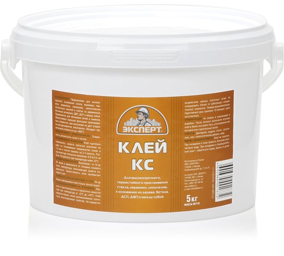 Клей Эксперт КС 5 кг 17713 - высокопрочный термостойкий клей (до + 400°С) применяется для приклеивания стекла, керамики, линолеума, к основанию из дерева, бетона, ДСП, ДВП и между собой. Идеально подходит для работ по облицовке печей и каминов.