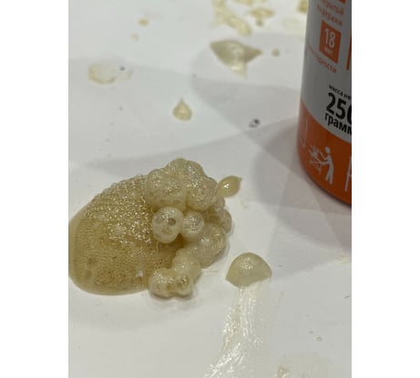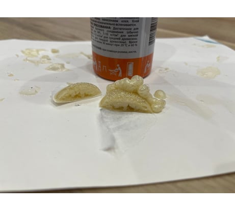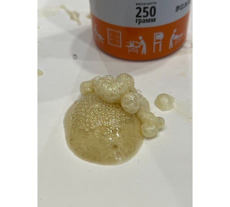 очень сильно вспенивается, хотя на бутылке написано "при отверждении незначительно вспенивается" - производитель наврал. По сути это медленная монтажная пена, пенится очень долго, смять пену получается, но она вспенивается снова и снова. В итоге можно клеить только неответственные детали, где точная подгонка не важна. Другими словами не клей, а редкостное дерьмо. Монтажная пена-клей значительно удобнее в использовании.
