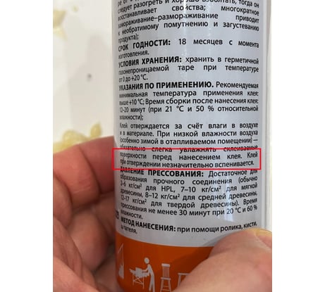 - Время сборки после нанесения клея: 12-20 минут (при 21°С и 50% относительной влажности). Клей отверждается за счет влаги в воздухе и в материале. При низкой влажности воздуха (особенно зимой в отапливаемом помещении) – обязательно слегка увлажнять склеиваемые поверхности перед нанесением клея.