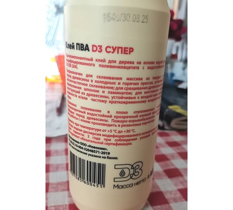 Однокомпонентный клей для дерева на основе водной дисперсии модифицированного ПВА с водостойкостью класса D3 (EN 204).