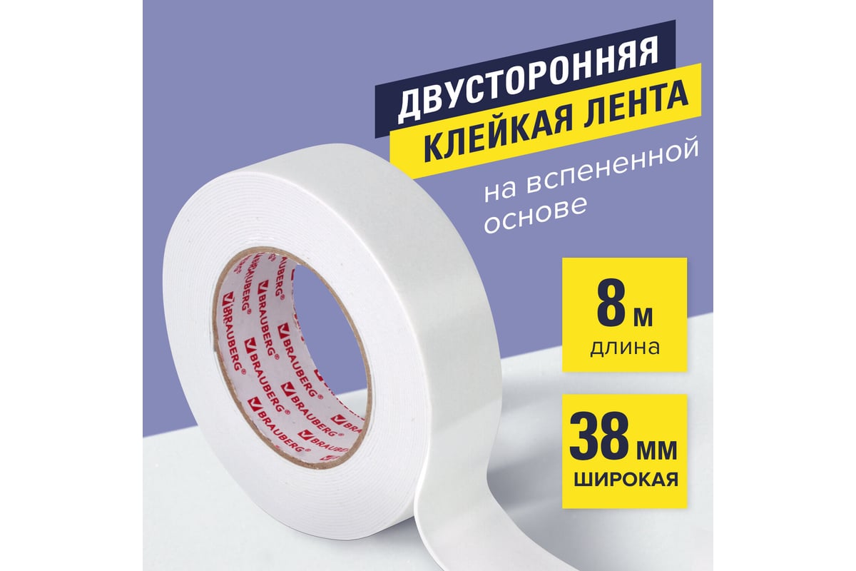 Вопросы и ответы о двусторонней клейкой ленте BRAUBERG 38 мм х 8 м, на вспененной основе, 1 мм, прочная 606422