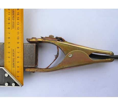 Жёсткая пружина уверенно держит клемму на месте, ширина захвата - 50 мм. Для непрофессиональной сварки вполне подходит.