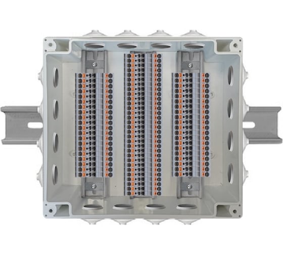 Клеммная коробка 250х230х100 на DIN-рейку, 70 клемм PUSH-IN (до 4мм2), 10 входов д. 20 мм с заглушками, цвет белый, предназначена для монтажа на DIN-рейку и коммутации электрических и кабельных линий, сигнальных шлейфов, цепей питания и любых других цепей переменного и постоянного тока. Cпособ фиксации коробки на DIN-рейку – защелка.
