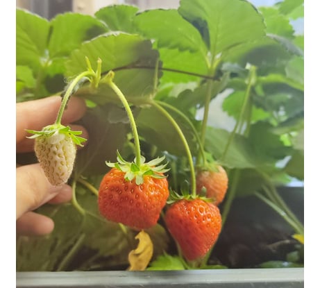 Срезала все усы, получилось за лето много кустиков, и пошли цветоносы!! С заморозками занесла в комнату, установила подсветку - вот такая клубника на стеллаже!