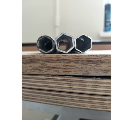 Вес вместо заявленных 50 гр. по факту - 39. Очень легкий, толщина стенки ровно 1 мм. На стороне, где размер 12 мм, штамповка граней так себе, с кривизной.