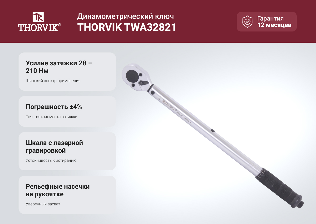 Ключ динамометрический THORVIK TWA32821 1/2DR, 28-210 Нм 054346