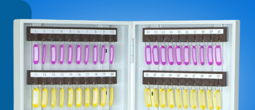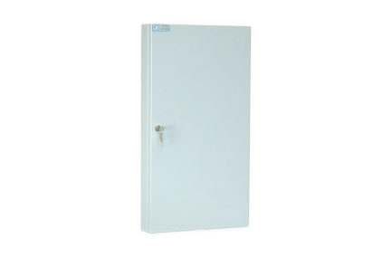 Ключница + 100 брелоков МЕТКОН КЛ-100Б MT_03_005_05_Ss представляет собой металлическую конструкцию габаритами 650х350х75 мм с толщиной стенки 1 мм. Отверстия в задней стенке допускают крепление модели к стене. Есть 10 планок для навешивания 100 комплектов ключей. Вес шкафчика составляет 5 кг. Качественный замок «Cam-Lock» исключает доступ посторонних к ключам.