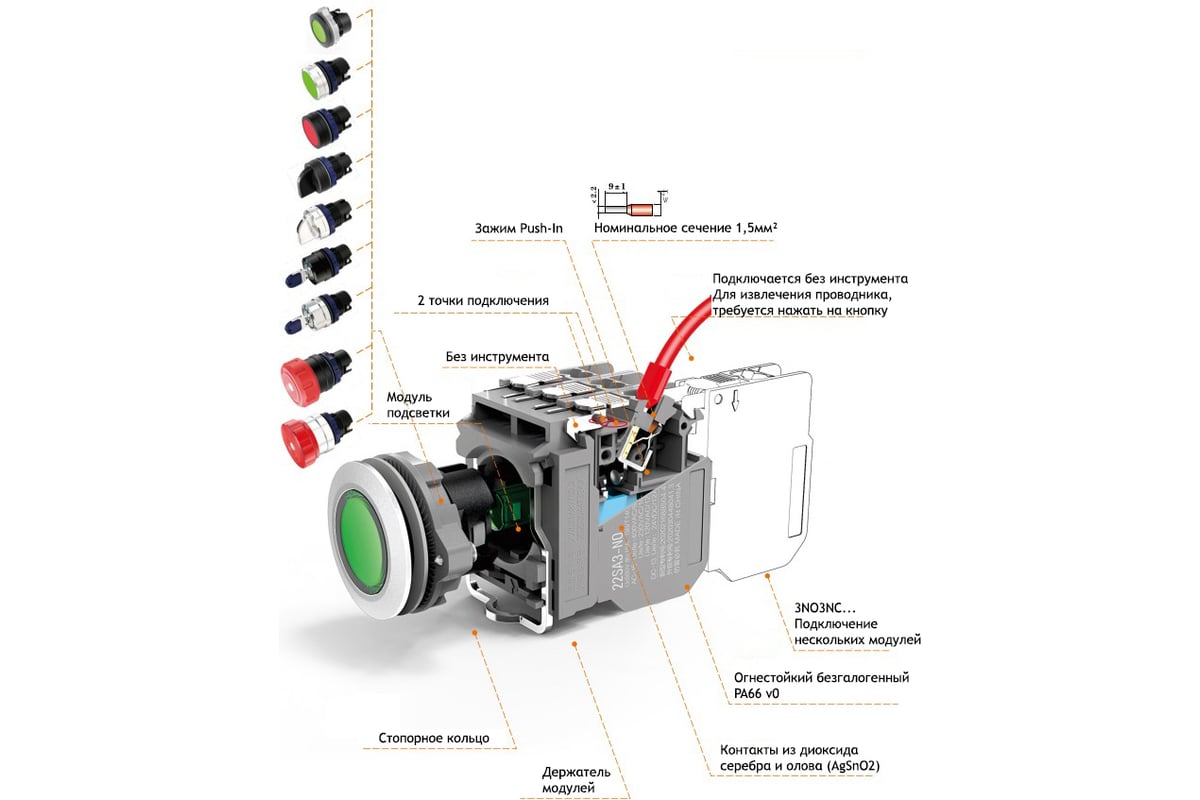 Для установки кнопки необходим держатель для трех модулей (TA22SA-ZZ) и контактный модуль с 1NC (TA22SA3-NC, TA22SA2-NС) или 1NO (TA22SA3-N0, TA22SA2-N0) контактами.