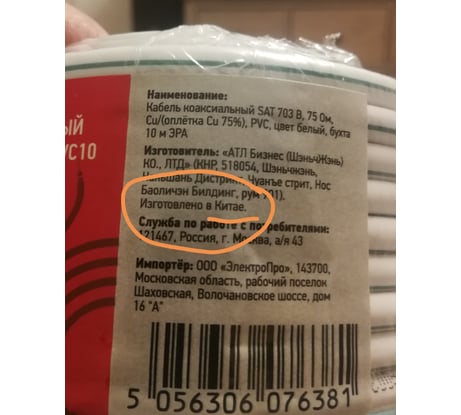 Жидковата медная оплетка экрана. В описании указан бренд России, сделано в России. На упаковке кабеля-производитель Китай.